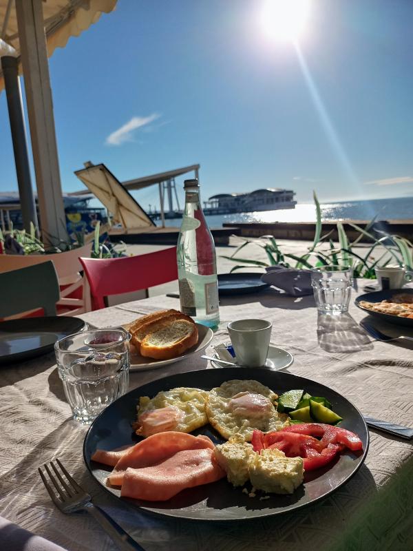 Durres selbst ist eine schöne Hafenstadt mit Sandstrand, sehr vielen Restaurants und Bars und einem sehr niedrigen Preisniveau. Ein vollständiges Essen für 2 Personen mit Getränke für unter 5€ ist hier sehr gut möglich. Für Frühstück ist allerdings schon gesorgt, die Eigentümer des Appartments betreiben auch ein Gasthaus bei dem es jeden Morgen frisch zubereitetes Frühstück gibt.