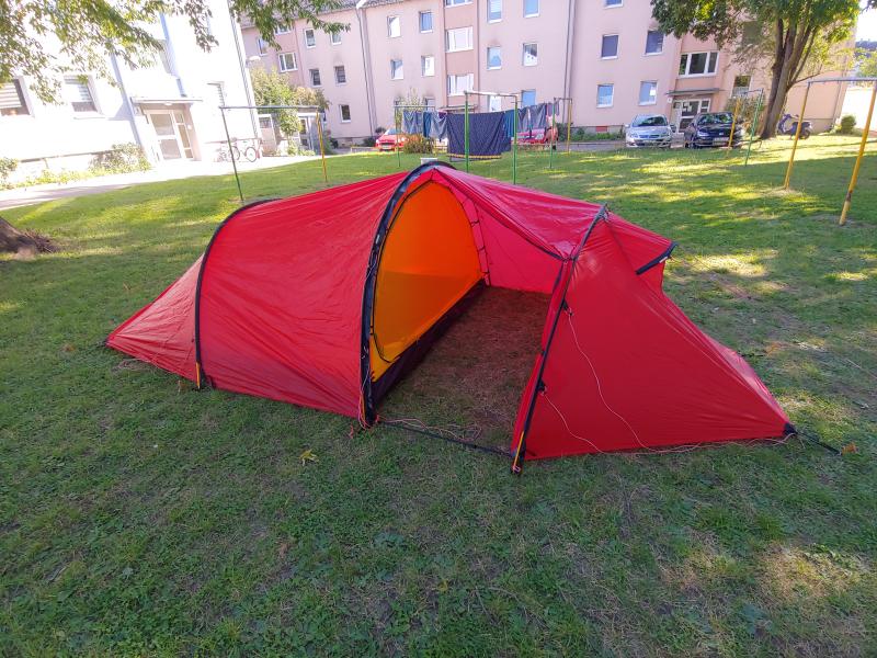 Als Zelt haben wir uns für das Hilleberg Nallo 4 GT entschieden. Der Vorteil von diesem Zelt liegt im vergleichsweise geringen Gewicht, einem sehr geräumigen Innenzelt (über 2m Breite) und einem großen Vorraum in dem man auch bei schlechtem Wetter kochen kann.