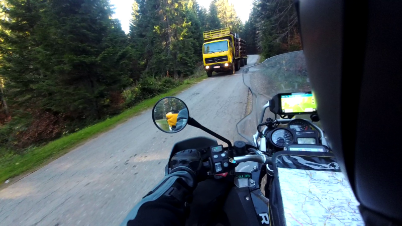 Danach geht es von der Hauptstraße weg und auf kleinsten Wegen durch Wald und Hügel. Wie hier zwei Autos aneinander vorbeikommen sollen ist mir sehr schleierhaft, bis ein großer LKW im Gegenverkehr keine Anstalten macht für uns abzubremsen sondern einfach ins Bankett ausweicht. Wenn man sich nicht auf die Straße beschränkt ist mehr als genug Platz da.