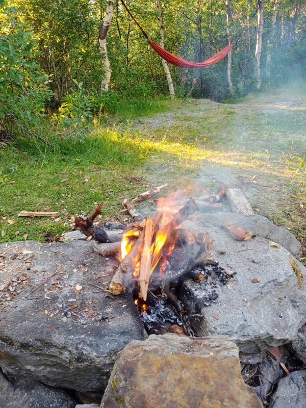 Hier lohnt es sich die Hängematte aufzubauen und Feuerholz zu suchen, außerdem ist es eine gute Gelegenheit die Wäsche zu waschen. Zum Abendessen gibt es Chili mit Reis, mit zweifacher Kocherausstattung kann man ziemlich gut Essen machen. Dann noch ein wenig gemütlich am Lagerfeuer sitzen bevor es ins Zelt zum Schlafen geht.