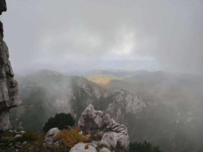 Dann wird der Weg aber tatsächlich anspruchsvoll und sehr anstrengend. Dazu kommt ein starker Wind, der vor allem an den exponierten Stellen viel Balance fordert. Trotzdem sind wir fest entschlossen es bis ganz nach oben zu schaffen und dort unsere mitgebrachte Brotzeit zu genießen. Oben angekommen sind wir im tiefen Nebel und machen Pause. Gerade wie wir mit dem Abstieg beginnen, macht der Himmel ein wenig auf und gibt kurze Blicke nach Slowenien frei.