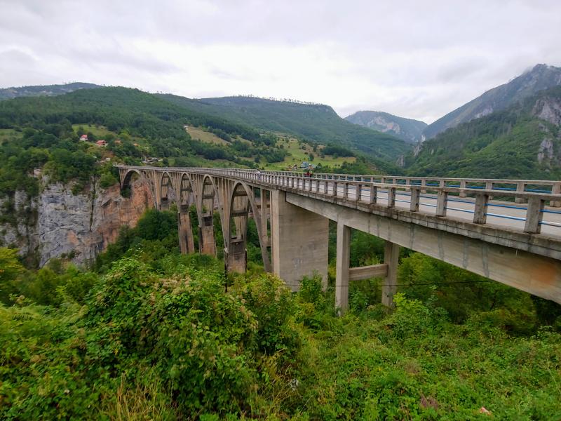 Nach dem Frühstück geht es zum Tara-Canyon, der größte Canyon in Europa und zweitgröße weltweit nach dem Grand-Canyon in den USA. Über diese Brücke sind wir gestern schon gekommen, wegen des schlechten Wetters aber nicht zum Fotografieren stehen geblieben. Heute ist es kaum besser, aber die letzte Chance also machen wir kurz halt.