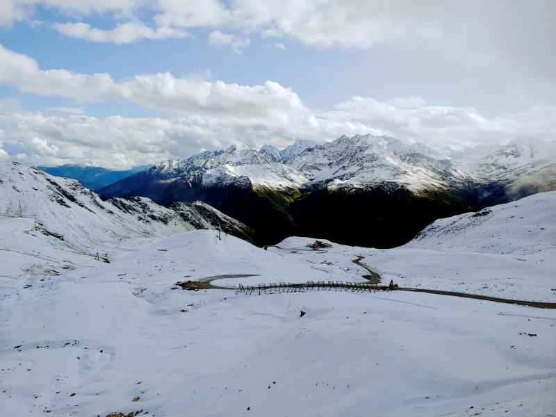 Der Spaß hält nicht so lange, dann kommen uns die ersten Schneeflocken entgegen, der Straßenrand wird zunehmend weiß. Oben angekommen, sind wir in einer wunderschönen - aber sehr kalten - Schneelandschaft. Auch wenn der Tacho vor Frost warnt, fahren wir zum höchsten Aussichtspunkt, die Griffheizung dabei voll aufgedreht.