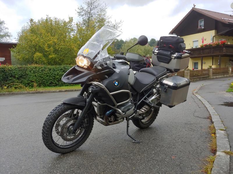 In Passau geht es bei leichtem Regen los. Bella - meine hübsche BMW - ist voll bepackt und geht auch bei Zweipersonen-Einstellung im ESA ein wenig in die Knie. Es geht sofort nach Österreich und nach einer knappen Stunde hört der Regen auf. Das trifft sich sehr gut, meine leichte Sommerkombi ist nicht wasserfest!