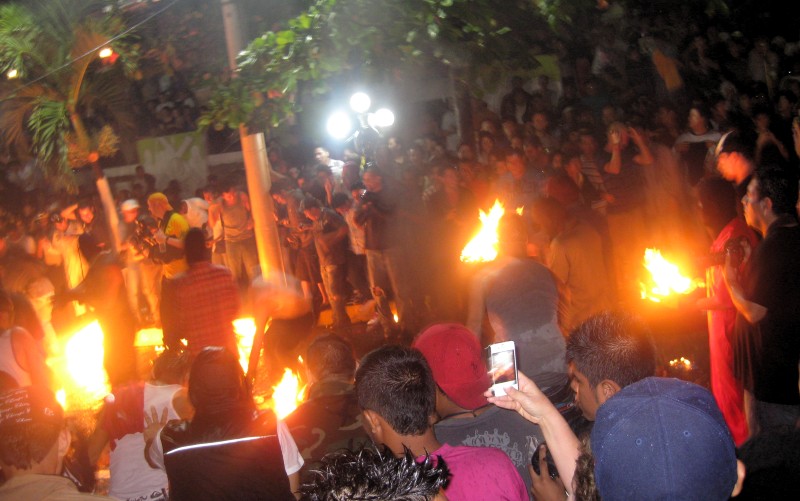 Die Feuerbälle fliegen immer nur für ein paar Minuten durch die Straßen, danach gibts immer kleinere Pausen damit wieder aufmunitioniert werden kann, die alten Bälle nachladen und neue zu besorgen.