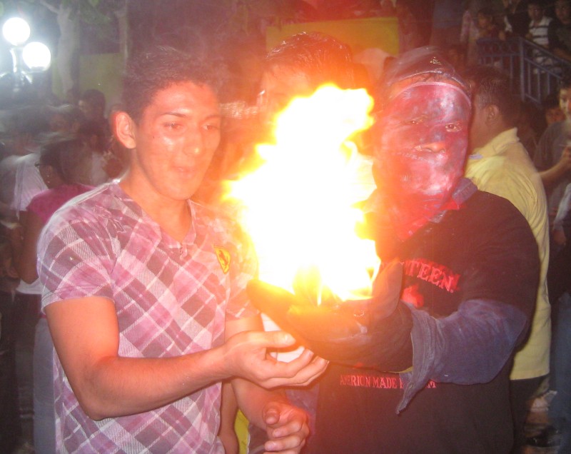 Im wesentlichen besteht das Fest darin dass sich zwei Gruppen total vermummter Jugendliche mit in Benzin getränkte, brennende Baumwollbälle bewerfen und einige davon auch zwischen den Zuschauern landen. Die genaue Bedeutung von diesem Fest habe ich leider nicht herausgefunden, es geht wohl irgendwie um den Bürgerkrieg. Leider stehen am Straßenrand und auf allen möglichen Aussichtspunkten bereits so viele Leute, dass wir kaum eine Chance haben selbst was zu sehen oder gar vernünftige Fotos zu machen. Während Friedenszeiten gabs die Gelegenheit ein bisschen ins Geschehen zu fotografieren: