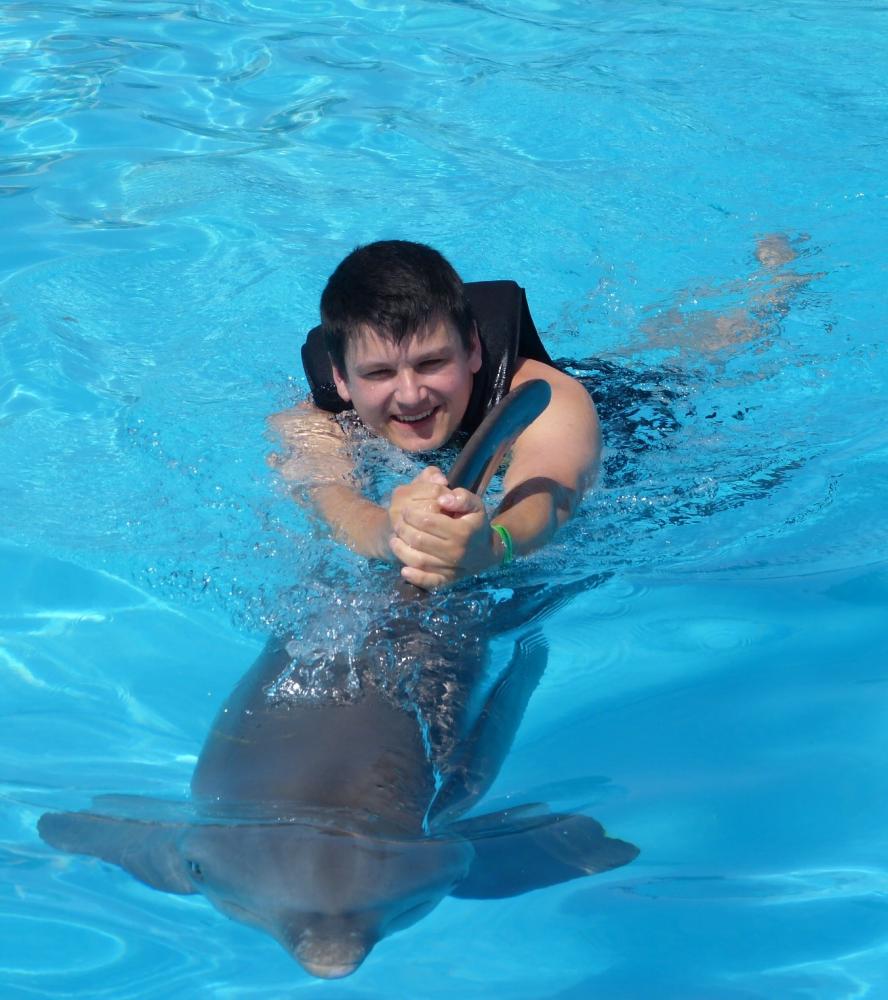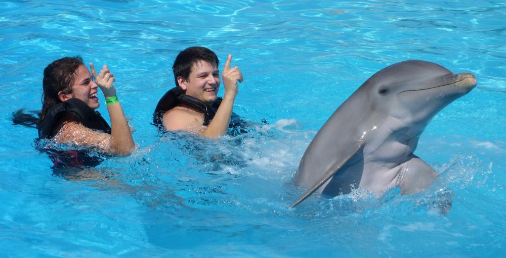 Zum Abschluss gibt es noch ein kleines Tänzchen mit den Tieren. Mit einer Handgeste kommt ein Delphin und dreht sich mit uns im Wasser. Danach ist der Spaß auch leider schon wieder vorbei, wir verabschieden uns von den Tieren und müssen wieder raus aus dem Becken.