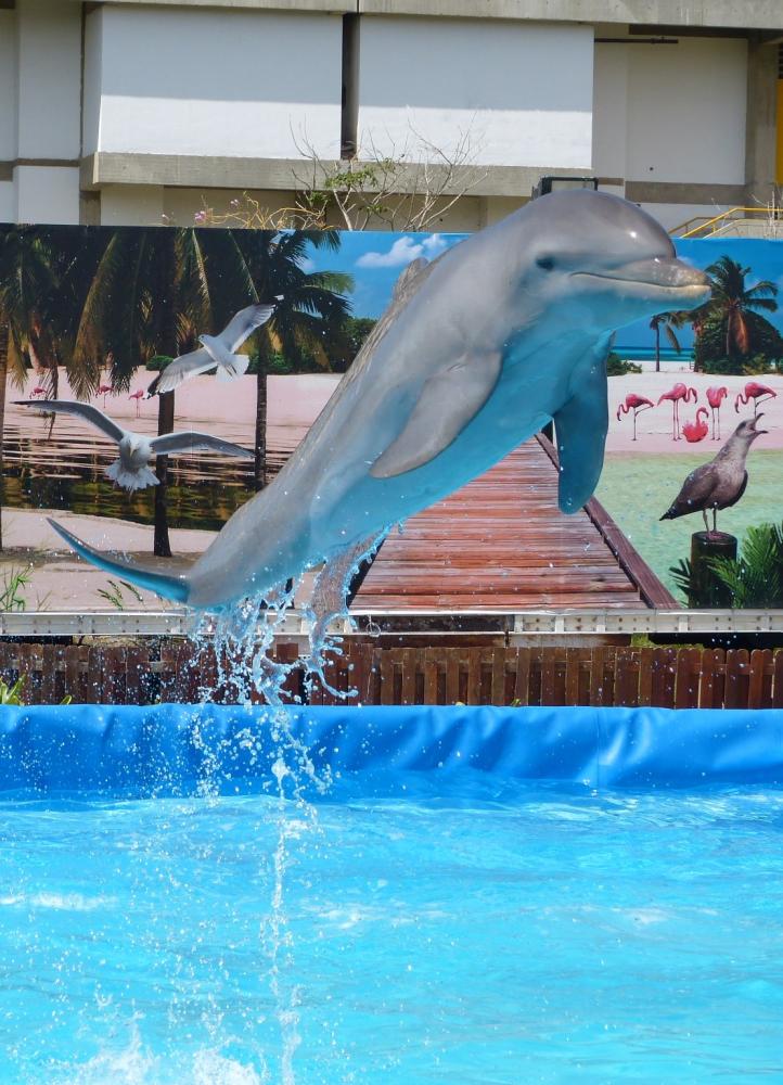 Heute geht es zu einem Schwimmbad mit Delphinen. Der Weg dahin geht 40 Minuten zu Fuß in der prallen Sonne. Ich nehme mein Handtuch als Sonnenschutz und laufe wie ein Scheich durch die Straßen. Zum Glück haben wir Wasser mit dabei. Im Schwimmbad angekommen, sind außer uns nur wenige Leute hier. Wir bezahlen und gönnen uns auch noch das Foto- und Videopaket, auch wenn es ziemlich überteuert wirkt.